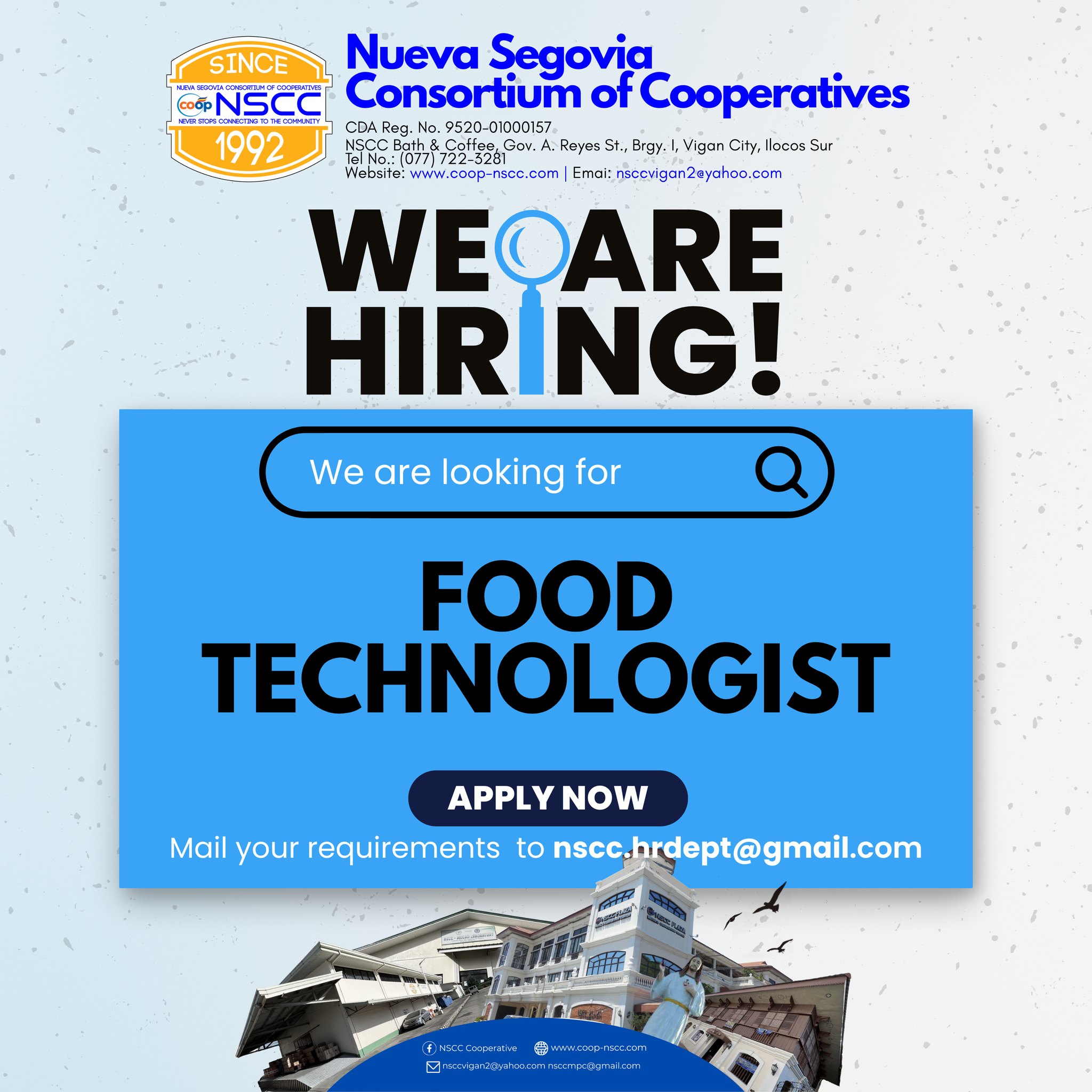 The Nueva Segovia Consortium of Cooperatives (NSCC) is looking for a dedicated and skilled Food Technologist to join our growing team! Interested applicants may personally submit or send via email (nscc.hrdept@gmail.com) their complete application requirements and Letter of Intent addressed to: